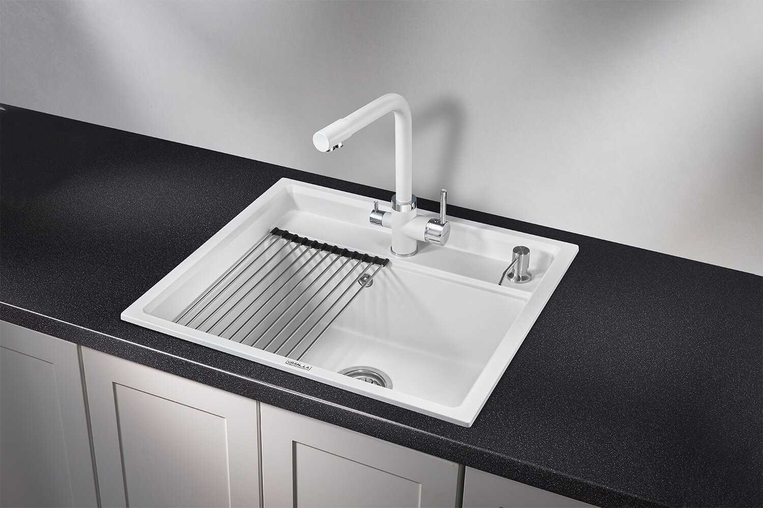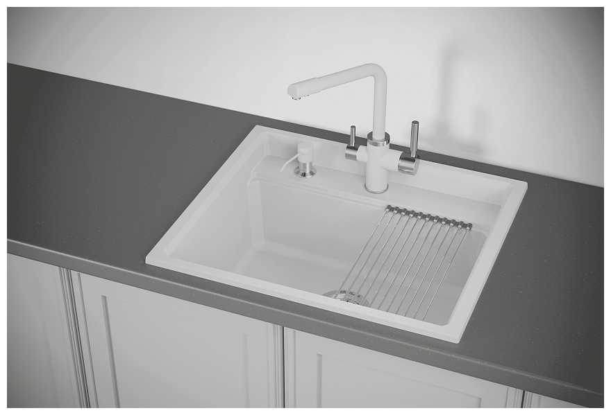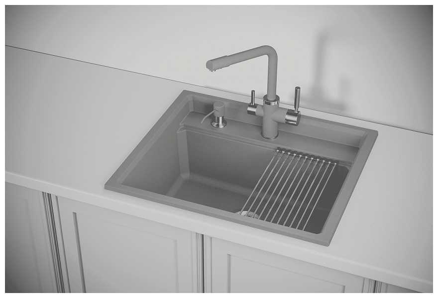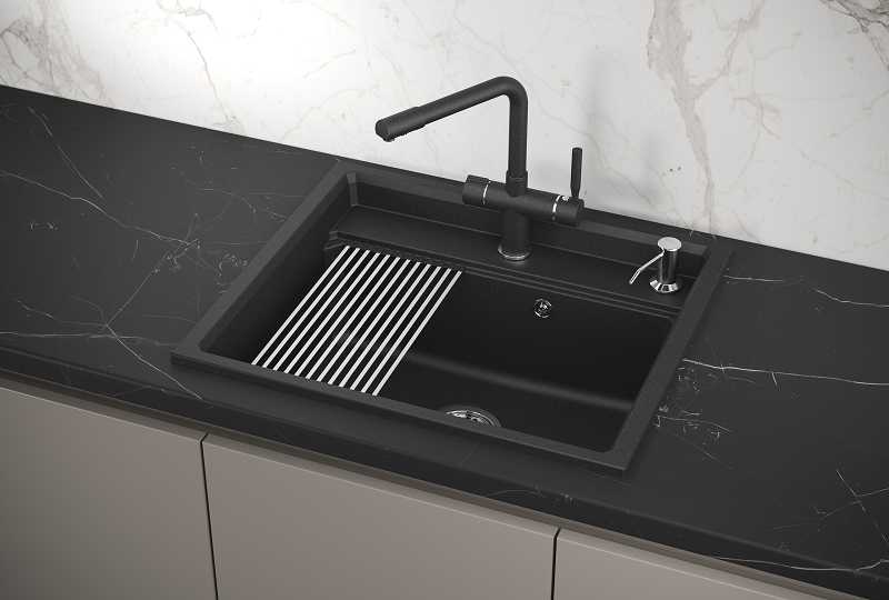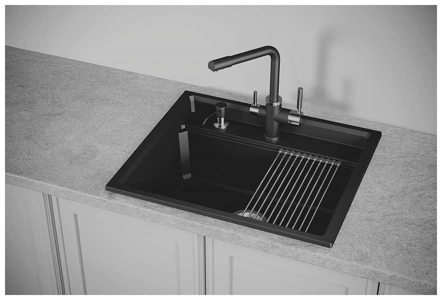 - + отличная раковина, пользоваться очень удобно, вода не разбрызгивается, ну и за счет того, что это почти каменная структура, не возникает мелких повреждений и царапин. также в комплекте двигающаяся подставка, на которой отлично стекает вода с помытой посуды или фруктов