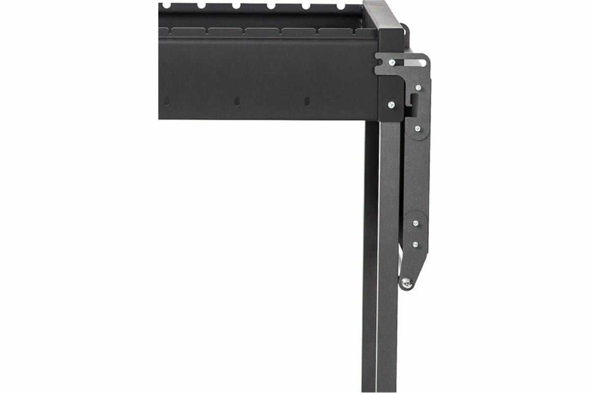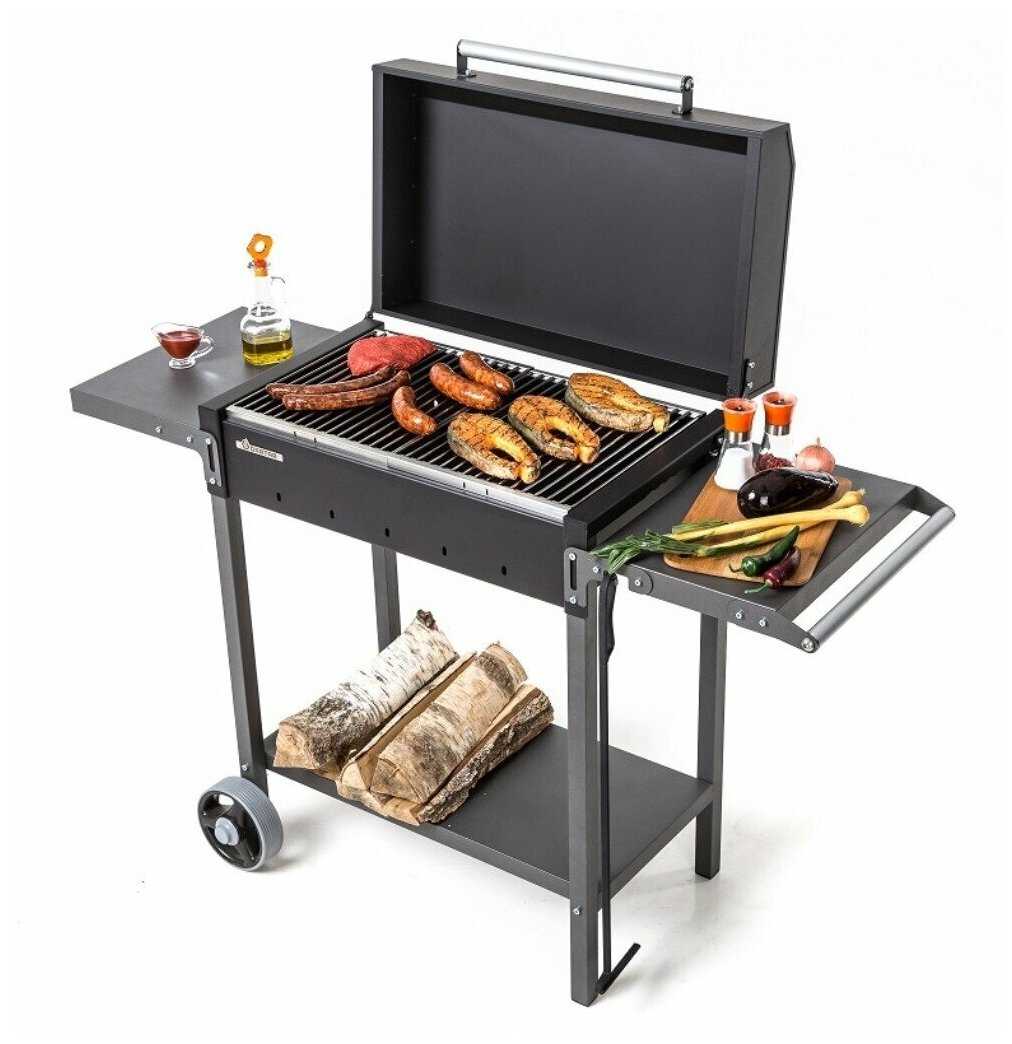 Высота рассчитана эргономично – готовить можно без наклонов, что снижает нагрузку на спину. Боковые столики и крючки расположены в зоне легкой досягаемости, а глубокий жарочный отсек предотвращает выпадение углей. -