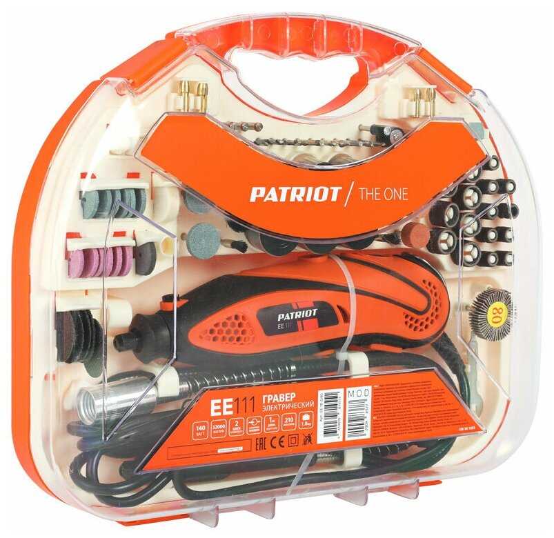 7/10 балловPATRIOT EE 111 The One / 140Вт / 10000-32000 об/мин / цанги 2,3мм/3,2мм / 210 насадок