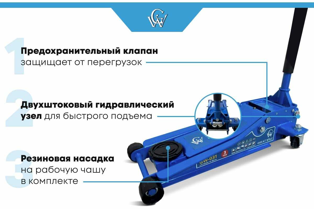 Характеристи Great Wolf Гидравлический подкатной домкрат (GW-031)
