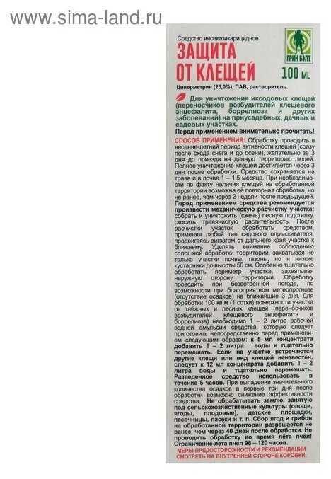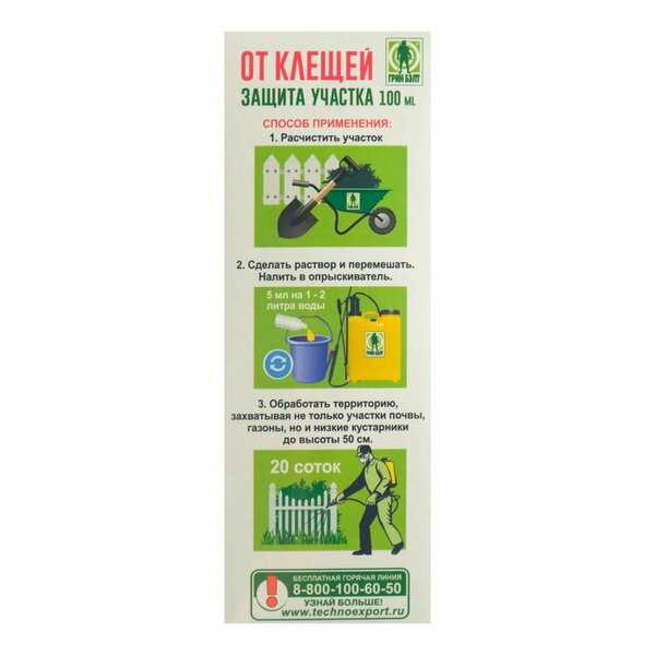 | Дополнительная информация : | Не обрабатывать землю, занятую под сельскохозяйственные культуры (овощи, ягоды, плодовые), детские площадки, песочницы, пасеки и т. п. Сбор ягод и грибов на обработанной территории разрешается не ранее, чем через 40 дней после обработки. |