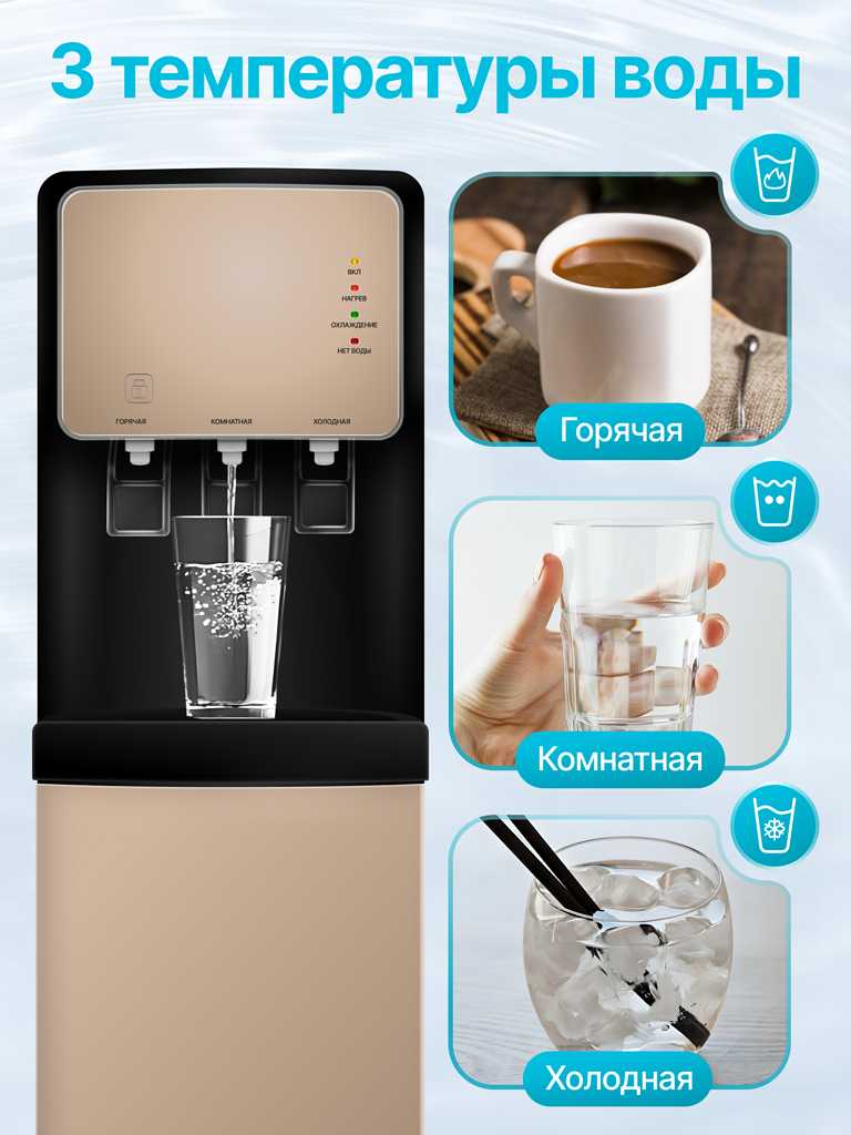Обязательно после того как вы установите его выключите жёлтую кнопку на задней панели!!! Как только будет включена жёлтая кнопка, сразу включится насос и если не будет доступа к бутылке с водой он может сгореть. И когда меняете бутылку сначала выключаете жёлтую кнопку и только потом меняете бутылку. Охлаждает хорошо прям вода такая приятно холодненькая. Однозначно советую эту модель, спасибо Яндекс Маркет и поставщику!!!