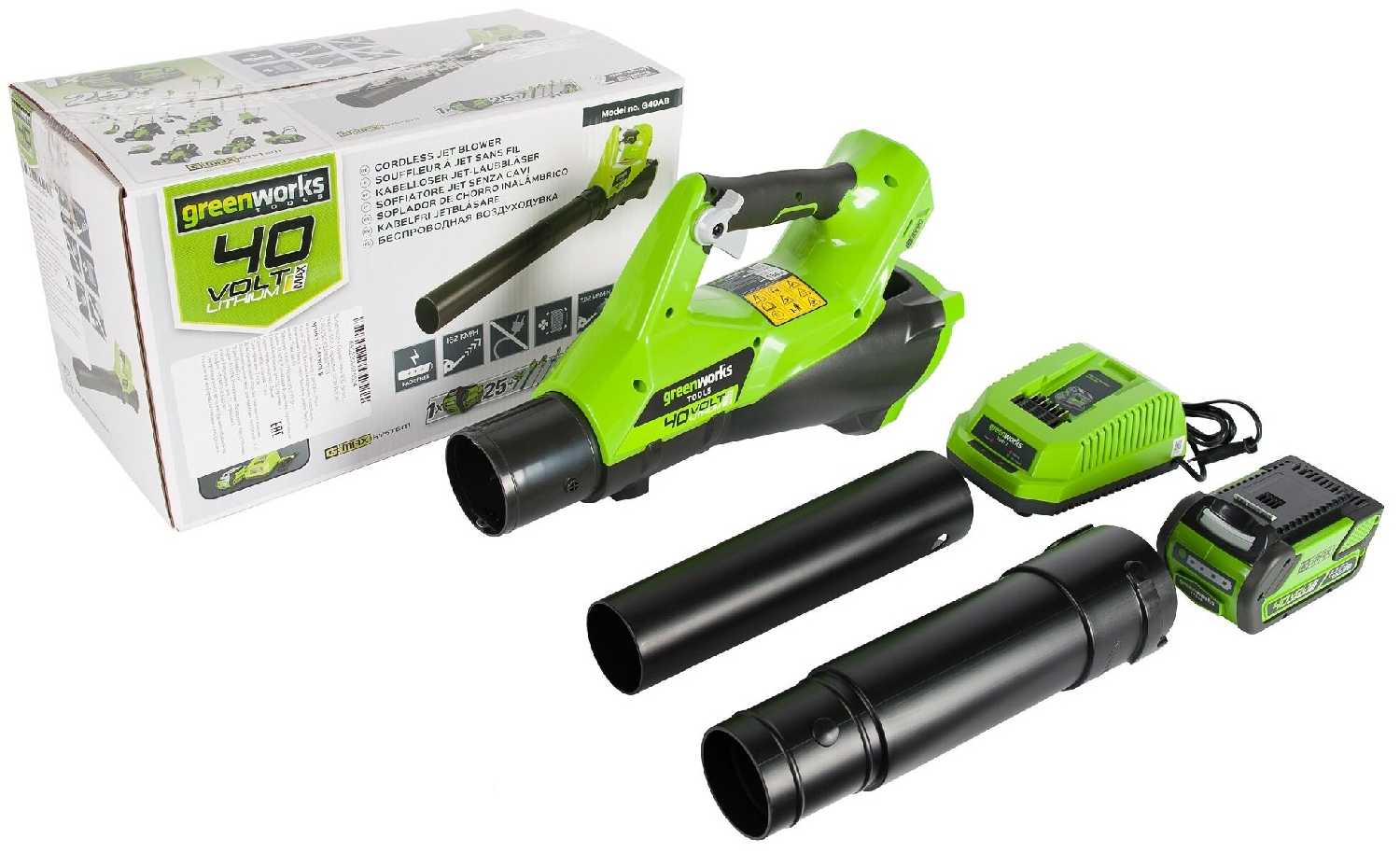 | Дополнительная информация : | Воздуходув, Аккумуляторная батарея 40V G-MAX на 4 А/ч, Зарядное устройство на 40V, Руководство по эксплуатации, Гарантийный талон, Упаковка. |