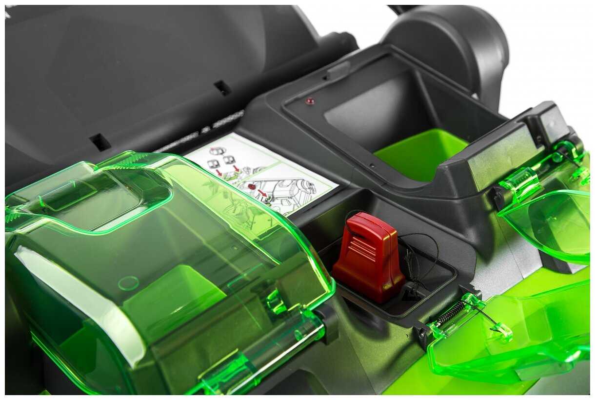 - + Не нужен не бензин, не токовый провод, зарядил аккумулятор вставил и поехал. Не смотря на свой вес, косить и управлять не сложно, главное что бы не нужно было никуда поднимать тогда это женщине не реально. Я сразу докупила второй аккумулятор и зарядное устройство, обработала примерно около 2 соток на одном аккумуляторе и он не разрядился полностью.