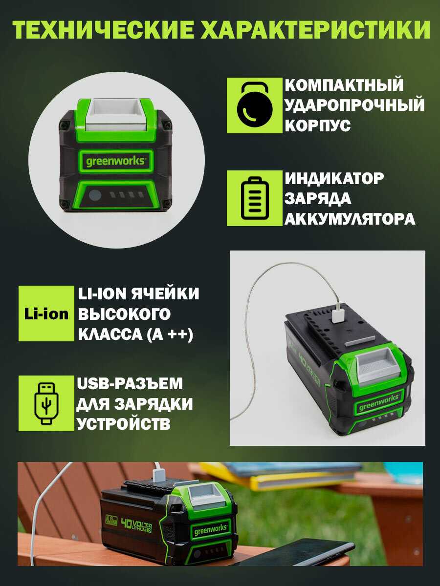 Аккумулятор совместим со всей линейкой Greenworks 40V, однако в отзывах есть исключения: на культиваторе G40TL он отключается даже на холостом ходу из-за особенностей контроллера. Механизм крепления вызывает нарекания — после 2-3 недель использования кнопка извлечения может залипать, требуя ремонта. Пользователи, эксплуатирующие батарею с 2021 года, отмечают снижение ёмкости на 20-30% за два года при нечастом использовании (2-3 раза в неделю). В сравнении со старыми моделями (до 2020 г.), где применялись элементы Samsung, новые АКБ быстрее деградируют.