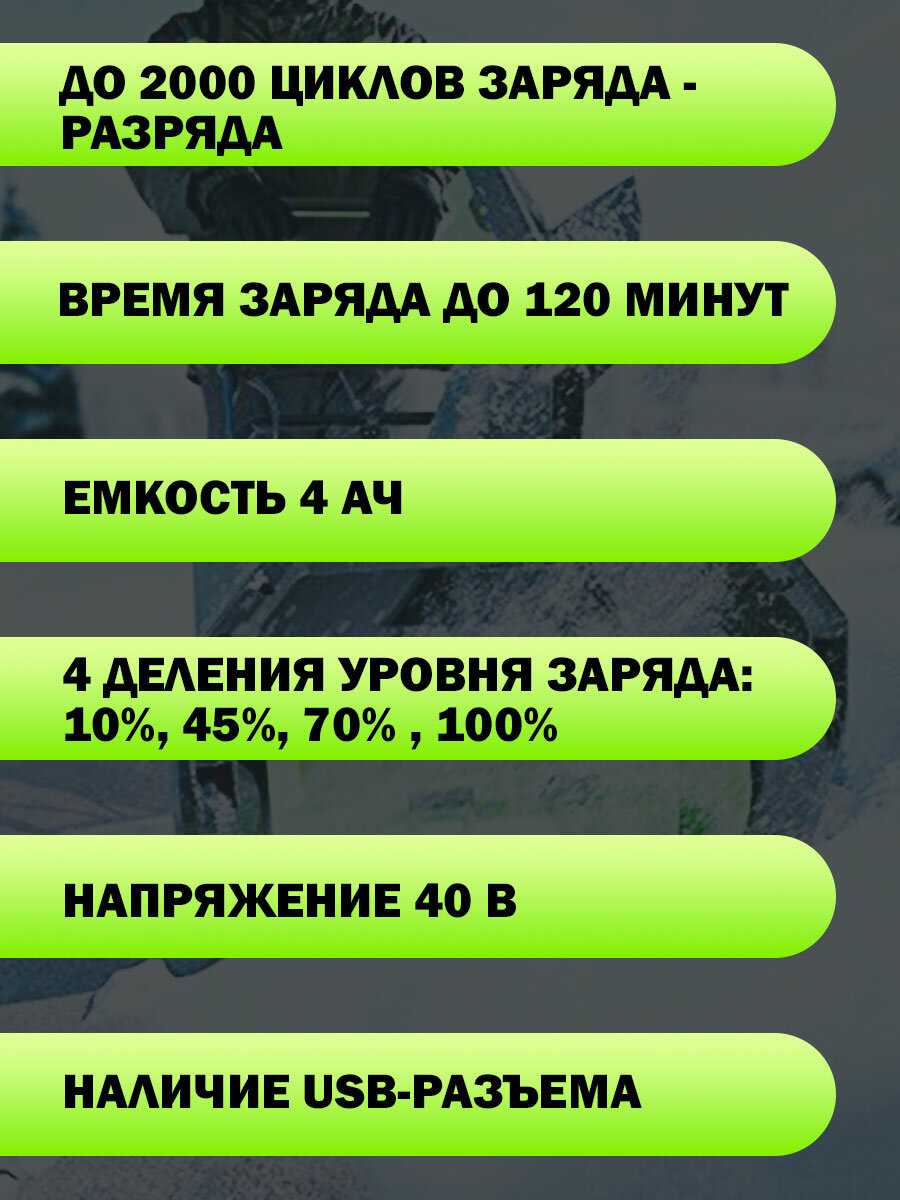 Ёмкости 4 Ач хватает на 30-60 минут работы в зависимости от инструмента: например, 40-50 минут для самоходной газонокосилки на участке 5-10 соток, 20-30 минут для культиватора или 45 минут для триммера со средней травой. Для мощных устройств, таких как колесный снегоуборщик Greenworks 2600807UA, заряда недостаточно даже для уборки небольшого участка — пользователи рекомендуют минимум 6 Ач. При этом на пиле аккумулятор показывает себя лучше: полного заряда хватает на распил 20-летней вишни с перекурами, а индикатор расходуется равномерно без резких провалов.