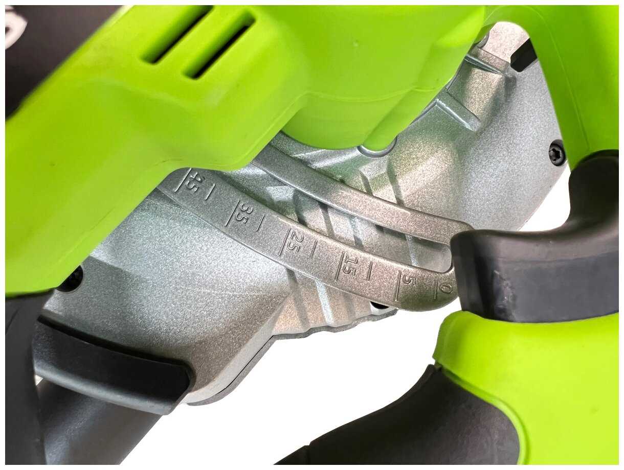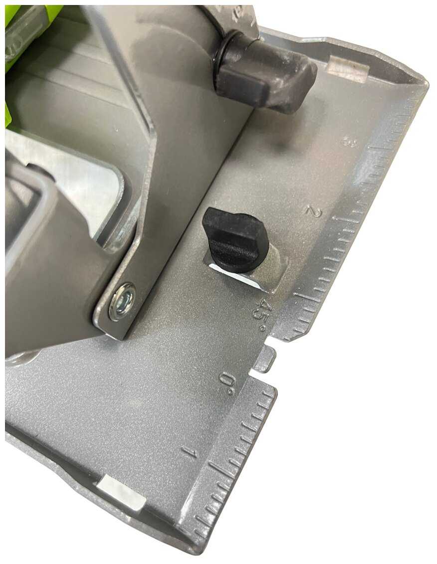 - Регулировка глубины пропила (до 45° наклона) с фиксацией рычажком — отсутствие люфтов по сравнению с винтовыми аналогами.
