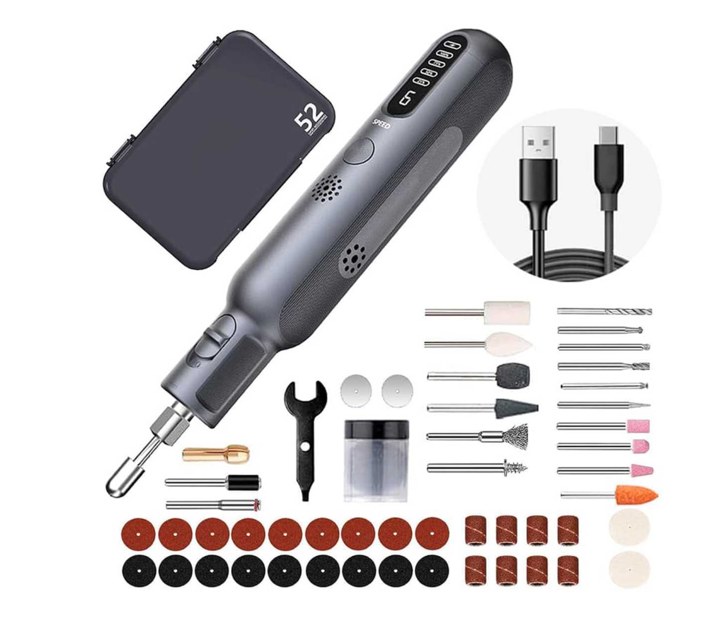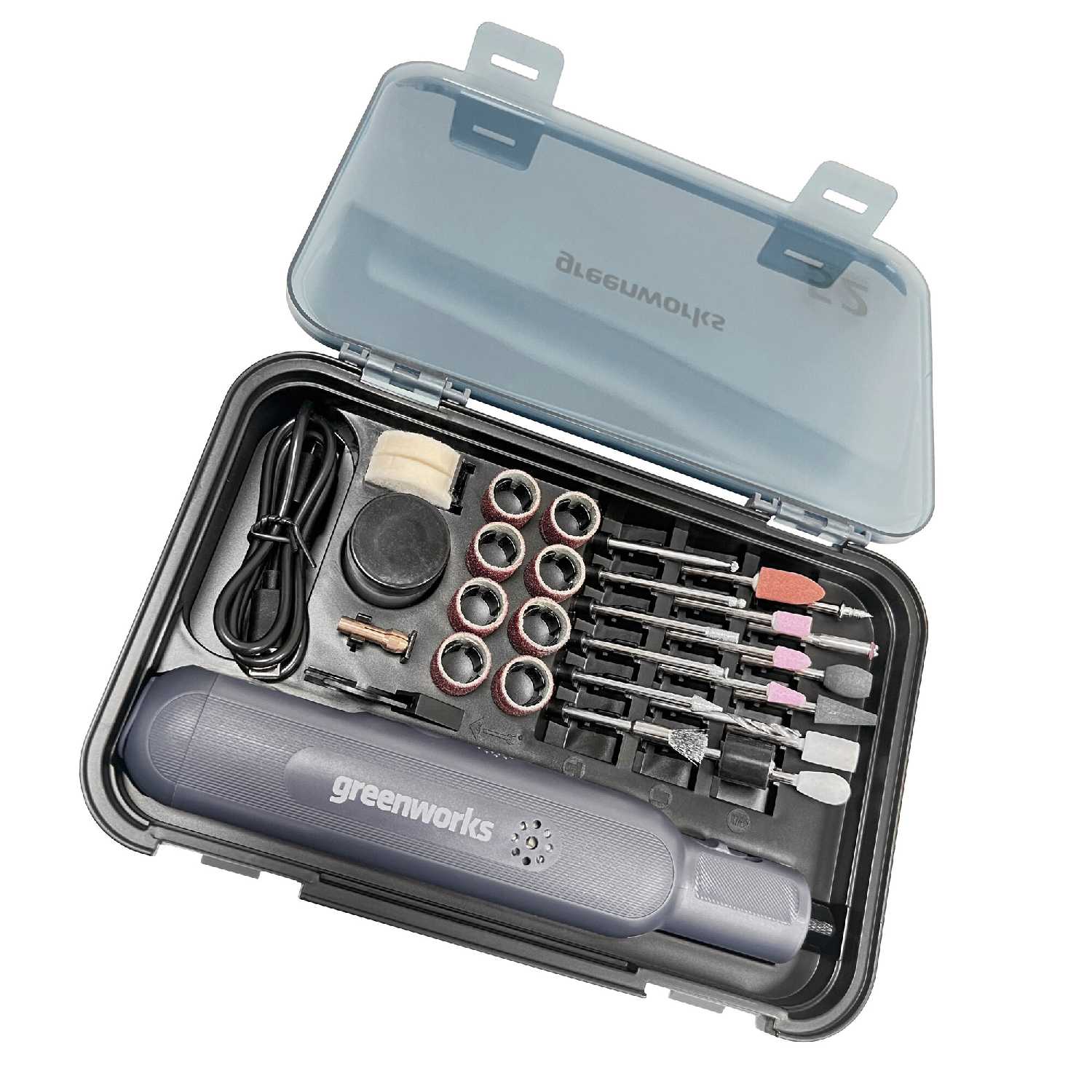 | Комплектация : | гравер, цанговый патрон 2.4 мм и 3.2 мм, набор оснастки 52 шт., кейс, кабель USB-C, руководство пользователя |