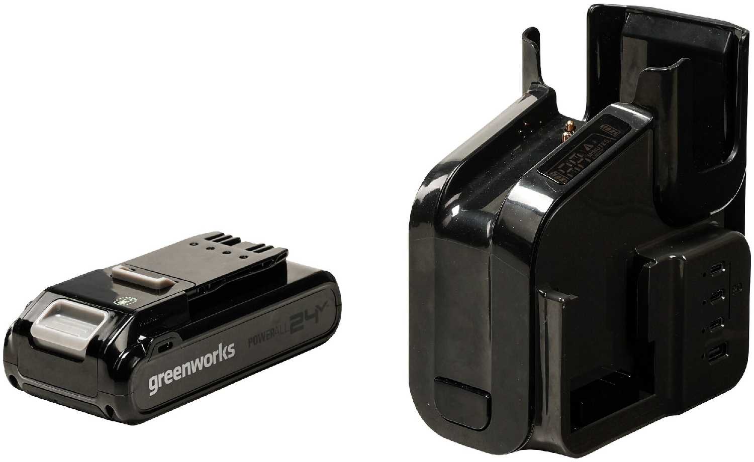Аккумулятор является съемным и совместим со всей экосистемой инструментов Greenworks на 24V. Пользователи успешно используют его с шуруповертами, триммерами, газонокосилками и другим инструментом бренда. Дополнительно аккумулятор может работать как power bank для зарядки мобильных устройств через док-станцию, что подтверждается опытом зарядки iPhone 14. -