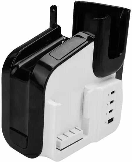 Зарядное устройство. Оно мощное, аж три разьема для зарядки любых устройств с поддержкой быстрой зарядки, но форм-фактор - это какая-то дичь. Об этом в недостатках. - - Дизайнеры зарядного устройства определенно хотели, чтоб он крепился на стену или что угодно, куда можно прикрутить крепежный элемент. У него нет никаких ножек, на столе я кое-как расположил боком. И запихивать туда АКБ в таком случае крайне неудобно. На месте продавца я бы заменил данный элемент комплекта.