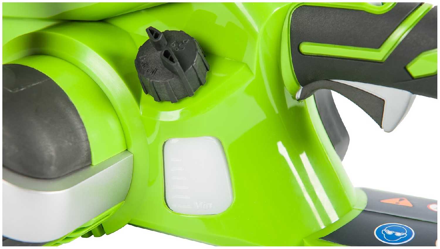 - Автоматическая подача масла смазывает цепь во время работы, продлевая её ресурс и снижая риск перегрева на 15-40 минут одной заливки.