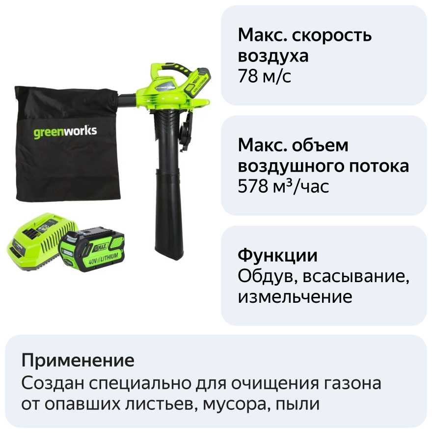 Характеристи greenworks Воздуходувка (GD40BVK4)