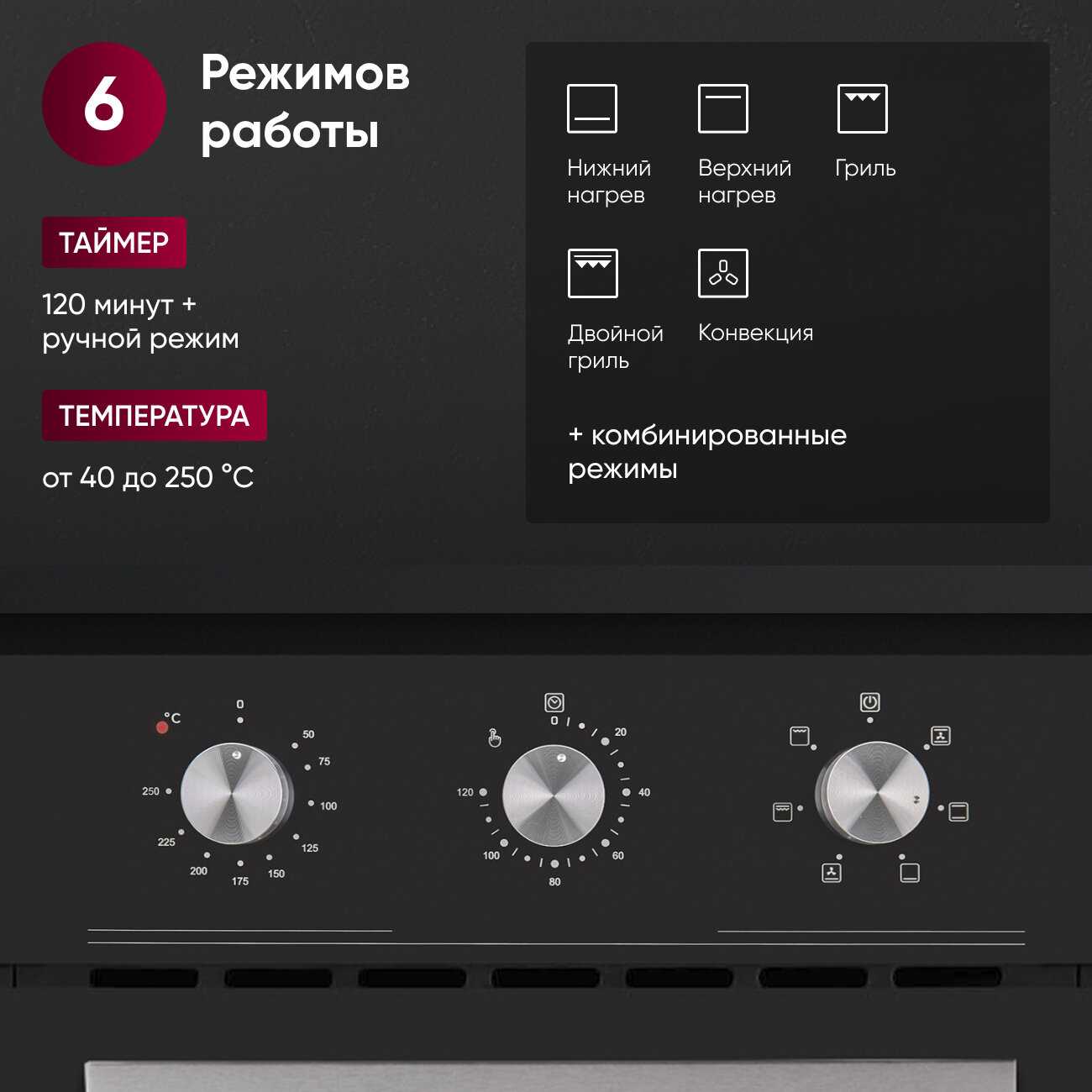 При ширине 45 см духовка оптимальна для малогабаритных помещений. Глубина и высота спроектированы так, что устройство не загромождает пространство. Несмотря на размеры, внутренний объём вмещает крупную птицу или противень на 6 порций.