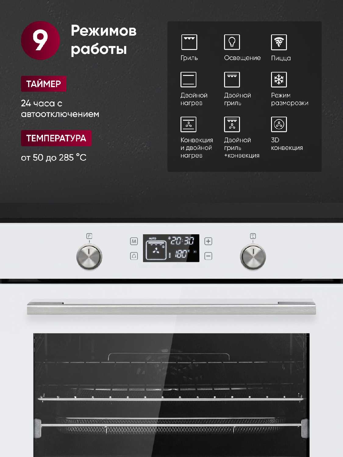 - + Великолепный духовой шкаф, выглядит современно. Проверили, все работает.