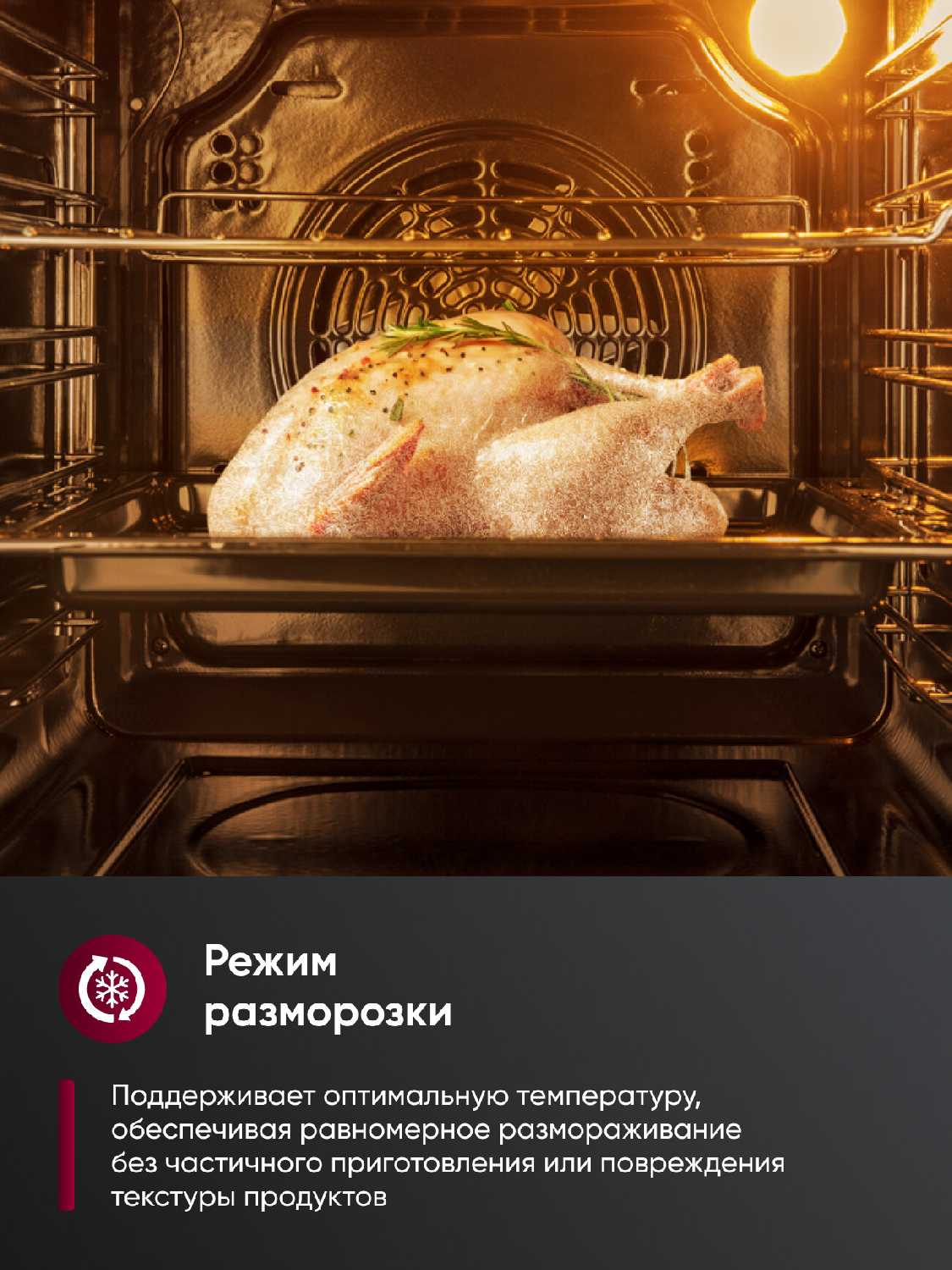 - + Эта модель радует простотой и надежностью в использовании. Дизайн выглядит аккуратно, а подсветка внутри работает отлично, так что все видно четко даже в полумраке. Часы на дисплее всегда активны и светятся, что удобно для контроля времени. Сенсорный экран отвечает только за часы, таймер и установку длительности готовки, а основное управление осуществляется механическими переключателями, которые надежны и понятны. Вентилятор можно задействовать отдельно для равномерного прогрева блюд. Есть защита от случайных касаний: чтобы активировать, нужно удерживать кнопку на сенсоре три секунды, иначе духовка остается в ручном режиме и не запустится. Плюс два дополнительных режима, где задается время или продолжительность, и по завершении нагрев отключается, хотя вентилятор с подсветкой продолжают работать.