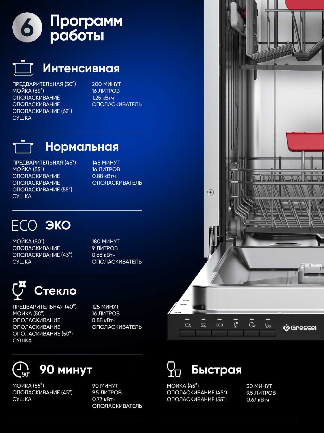 | Программы : | быстрая, интенсивная, стекло, экономичная |