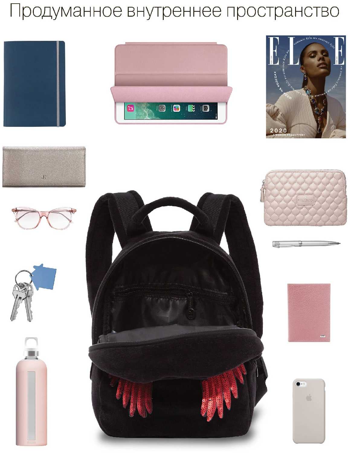 Внутри есть дополнительные карманы. Так что всё войдёт.