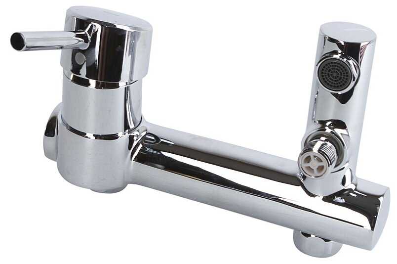 Излив недлинный, струя воды из него льётся строго вертикально и до неудобности близко к краю ванны.