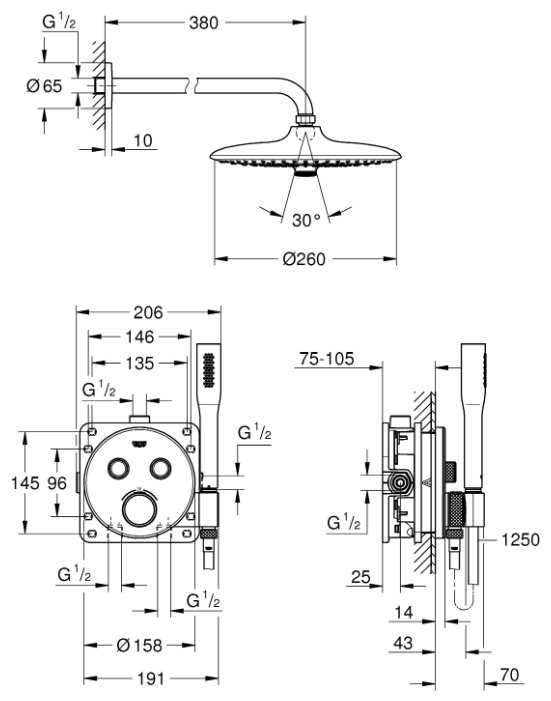 | Дополнительная информация : | термостатический смеситель Grohtherm SmartControl: стопор безопасности при 38°C опционно ограничитель температуры на 43°C / 46°C распределение расхода: выход B = 24 л/мин ручной душ = 12 л/мин выход B + ручной душ = 27 л/мин, душевой шланг: предел прочности 500 N максимальное давление до 5 бар Термостойкость до 70°C |