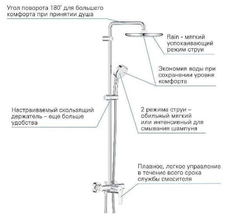 | Особенности : | S-образные эксцентрики, антиизвестковое покрытие, держатель душевой лейки, защита от обратного потока, защита от скручивания, регулируемый верхний душ |