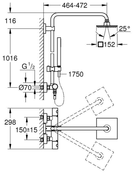 | Дополнительная информация : | система twist-free внутренний охлаждающий канал, высота стойки для душа: 1132 мм, вылет верхнего душа: 472 мм, длина верхнего душа: 152 мм, ширина верхнего душа: 152 мм, горизонтальный поворотный душевой кронштейн 450 мм, ручной душ регулируется по высоте с помощью скользящего элемента, минимальный расход воды 7л/мин |
