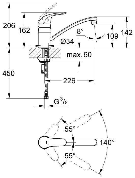 - - Нужен переходник 1/2 на 3/8 (этот размер - стандарт у Grohe) для установки.