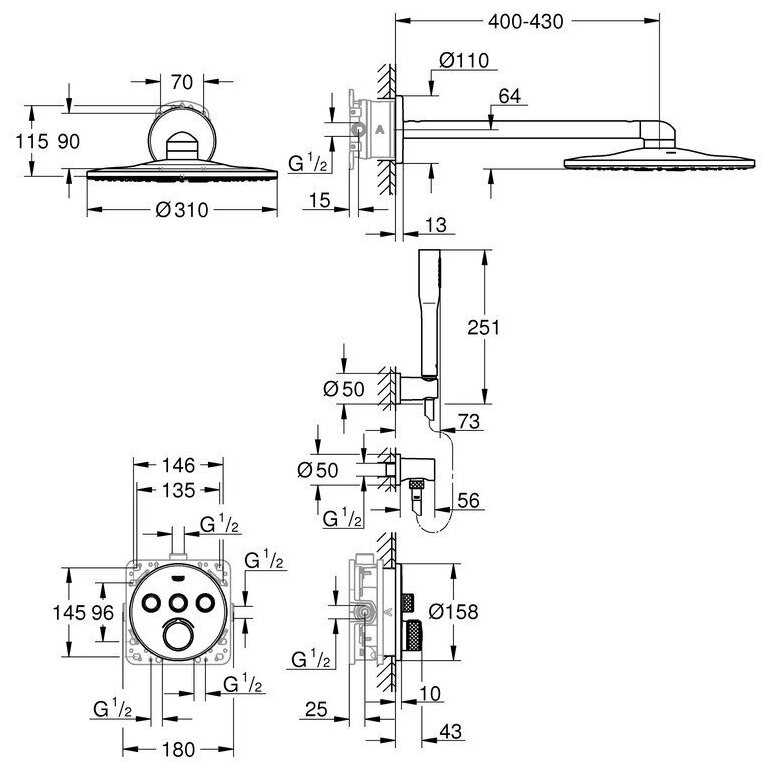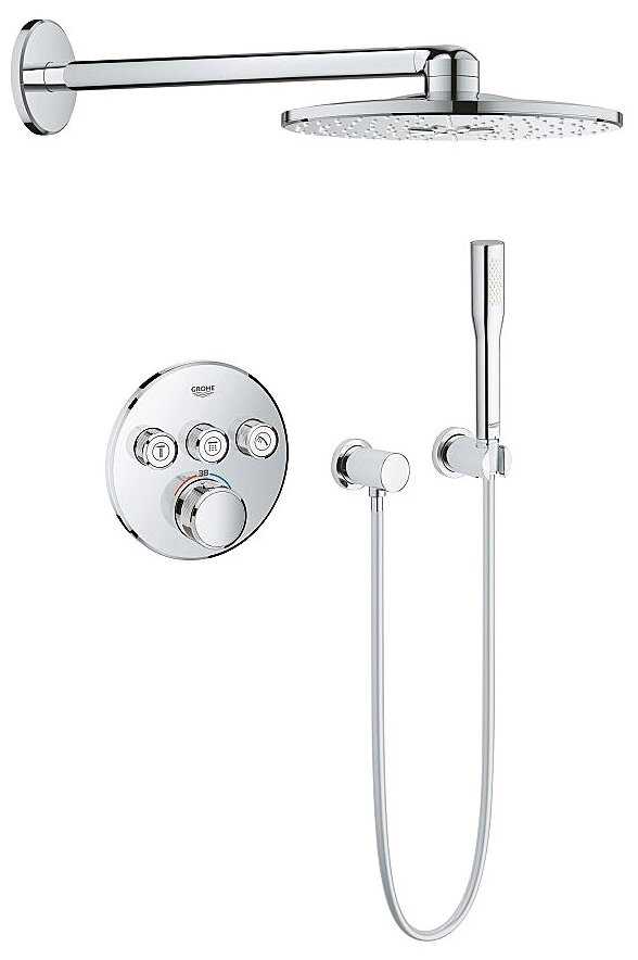 | @Комплектация : | термостат встраиваемого монтажа SmartControl, круглый верхний душ Rainshower 310 SmartActive (включая душевой кронштейн диаметром 400 мм и встраиваемый механизм), ручной душ Euphoria Cosmopolitan Stick с держателем, душевой шланг Silverflex с функцией анти-скручивания и универсальный встраиваемый механизм GROHE Rapido SmartBox |