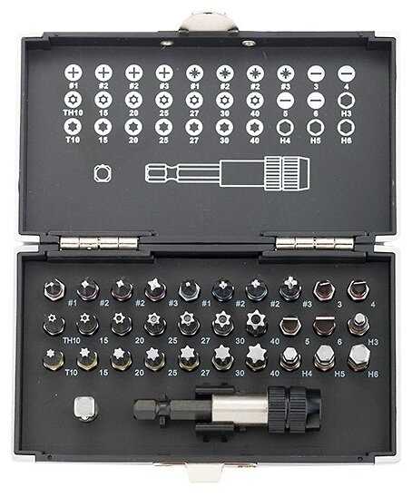 | Биты подробно : | PH1, PH2x2, PH3, PZ1, PZ2x2, PZ3, SL3, SL4, SL5, SL6, TR10, TR15, TR20, TR25, TR30, TR40, H3, H4, H5, H6, T10, T15, T20, T25, T27, T30, T40 |