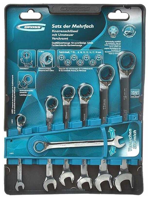 | Дополнительная информация : | В комплекте :Ключи комбинированные 7 шт: 8, 10, 12, 13 14, 17, 19 мм, Пластиковый держатель. |