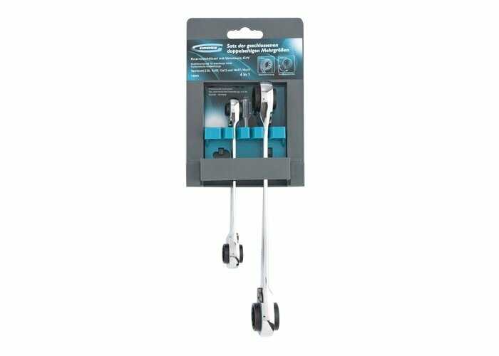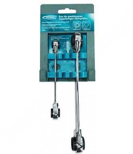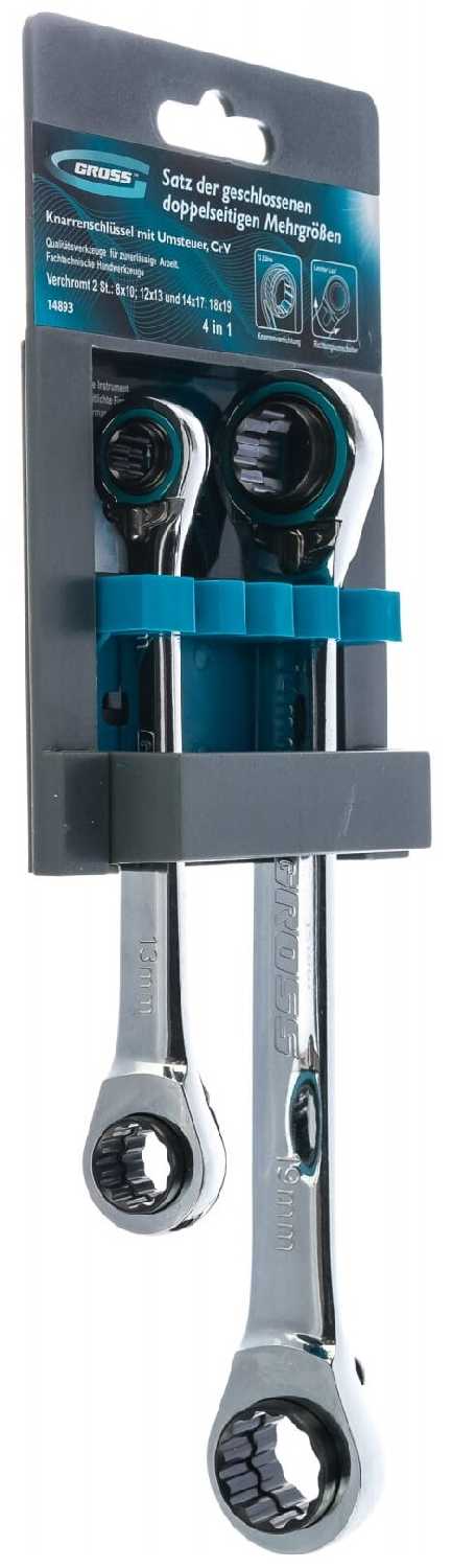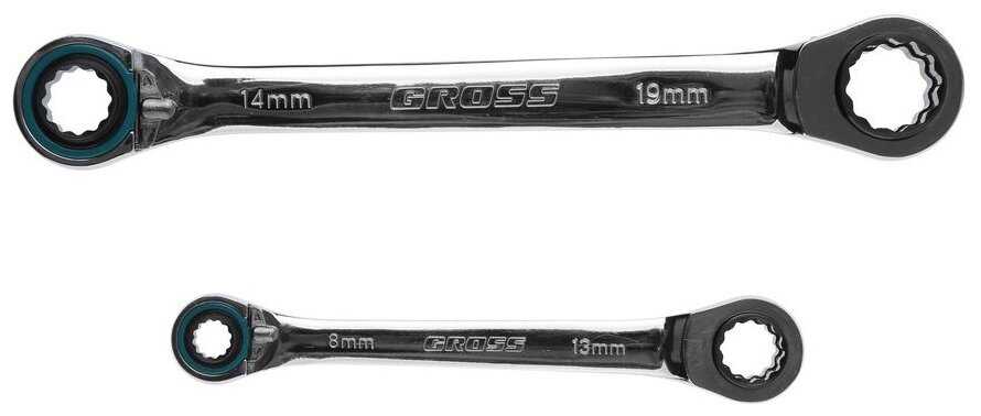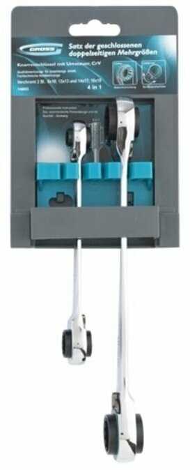 Ключи довольно интересны своей конструкцией. Два ключа заменяют восемь накидных. Размеры самые ходовые: 8, 10, 12, 13, 14, 17, 18 и 19 мм. Изготовлен из высококачественной хромванадиевой (Crv) стали. Ключи оснащены реверсивным 72-зубчатым храповым механизмом. Минимальный угол поворота ключа составляет 5 градусов.