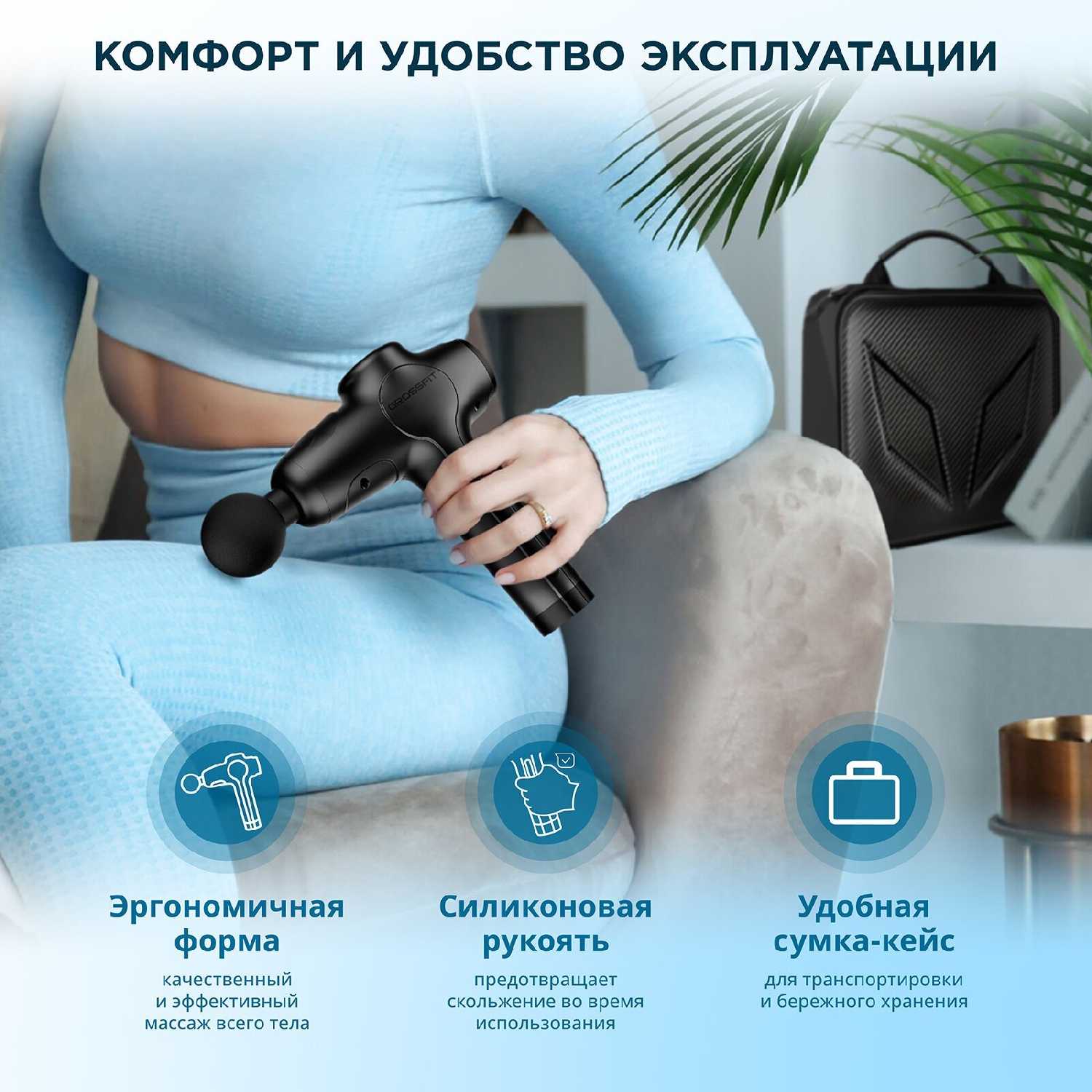 Пользователи выделяют три особенности: плавную регулировку скорости (в отличие от ступенчатых переключений у конкурентов), эргономичную форму рукояти с антискользящими вставками и комплектацию ударопрочным кейсом. Это обеспечивает точную настройку массажа и удобство хранения.