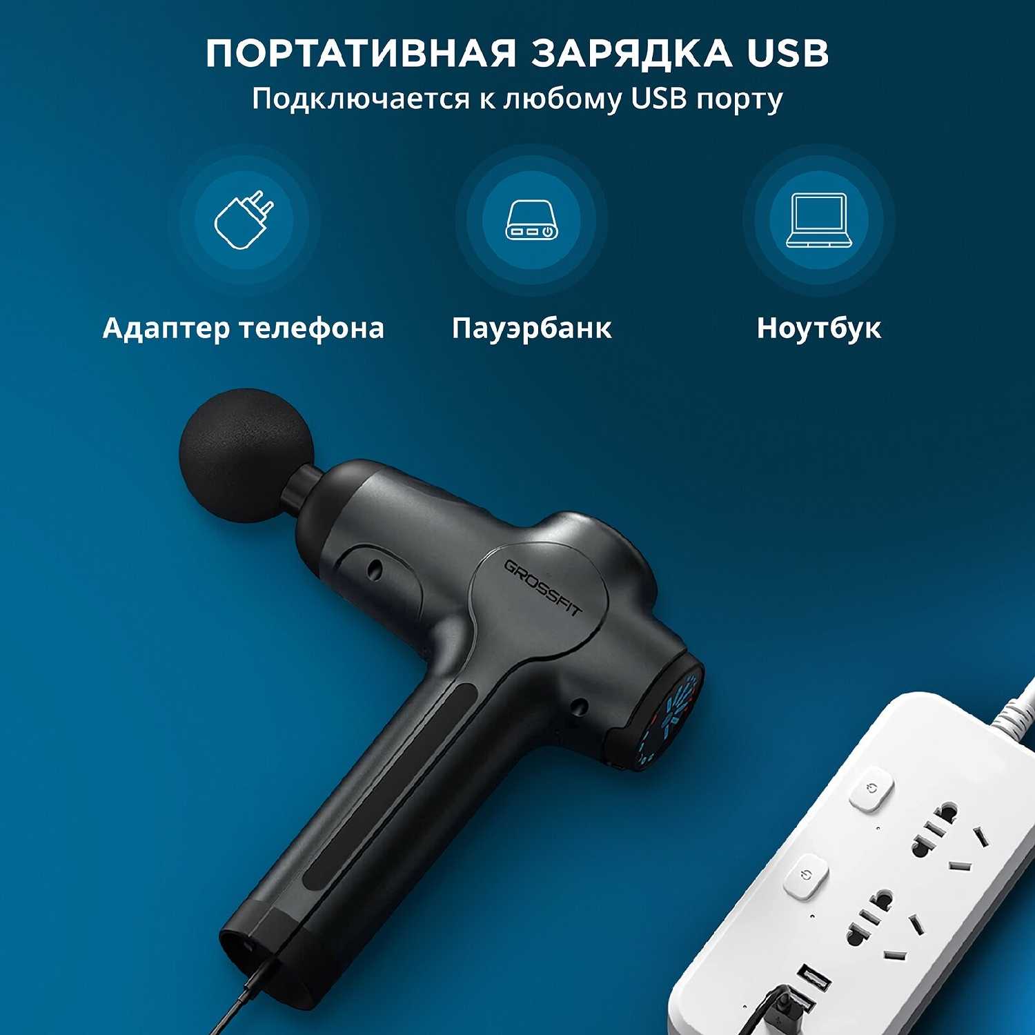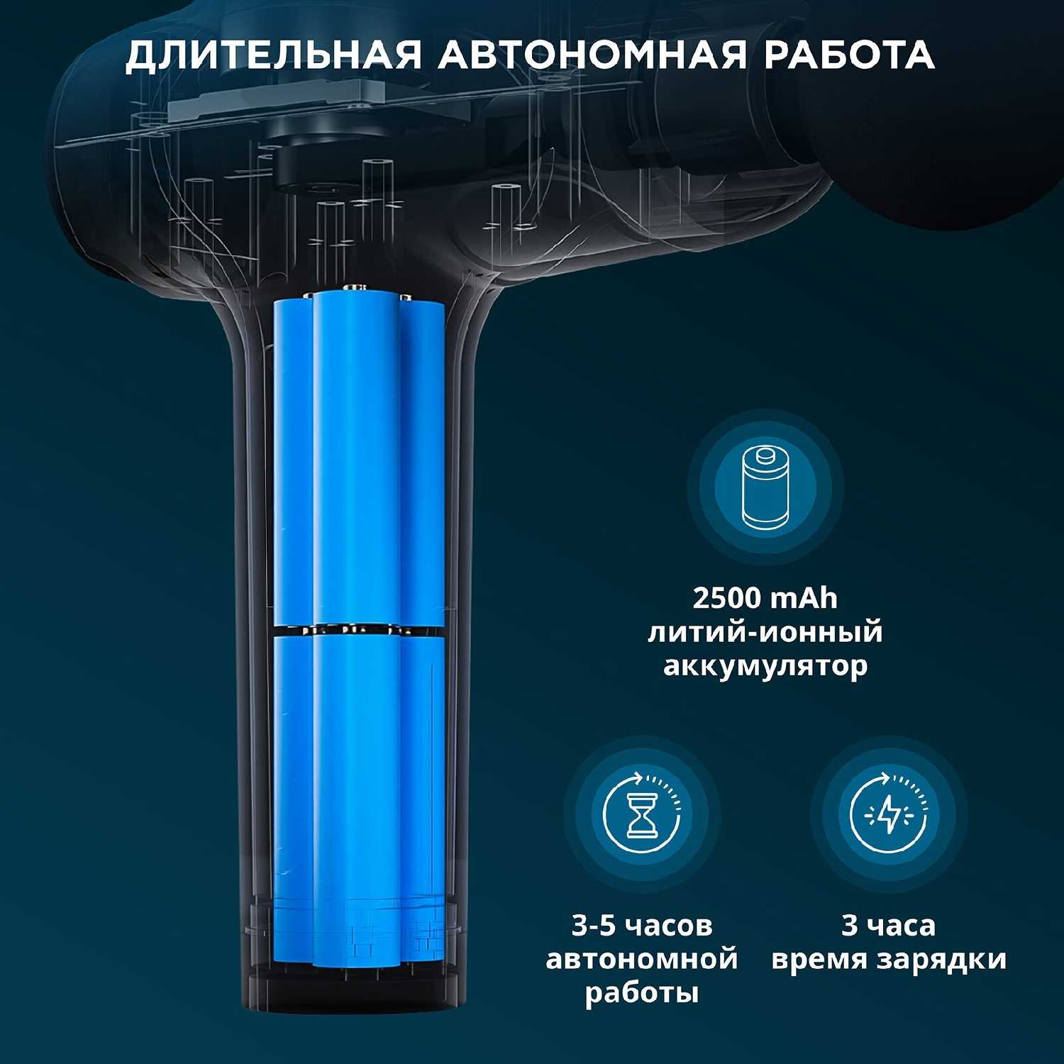 При использовании 2-3 раза в неделю по 10-15 минут батареи хватает на 3-4 недели. Однако время работы сокращается при активном надавливании во время массажа или применении максимальной мощности. Зарядка через USB-C занимает около 2 часов, но некоторые отмечают проблемы с зарядкой от сетевых адаптеров (рекомендуется прямое подключение к ПК).