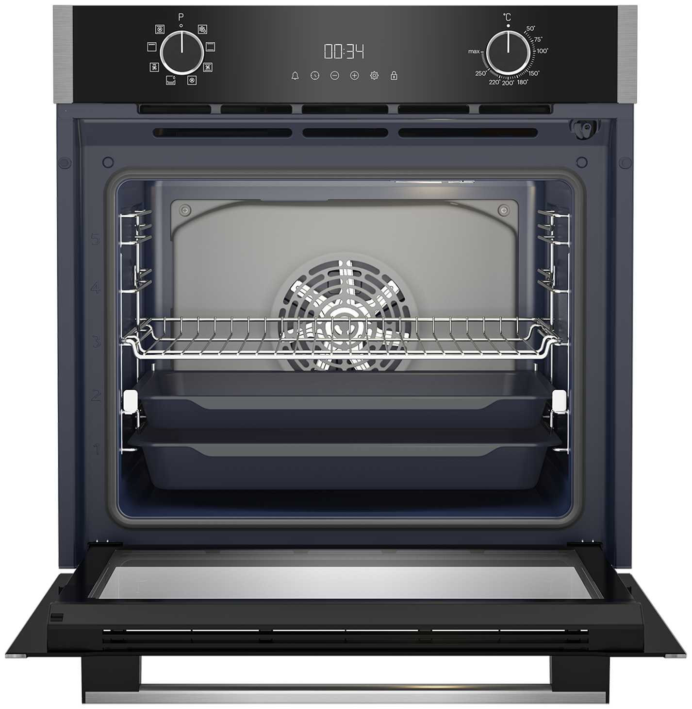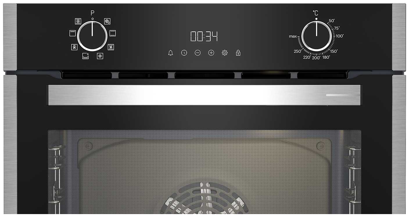 Отличная современная духовка, работает на все 100. Оснащена 9 режимами работы, есть даже гриль и конвекция. Управляется с помощью переключателей и сенсорной панели со встроенным таймером. Имеются телескопические направляющие и доводчик на дверце.