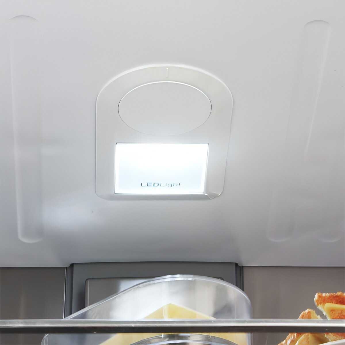 - Синяя подсветка в зоне свежести замедляет распад хлорофилла, продлевая срок хранения овощей и фруктов на 30%.