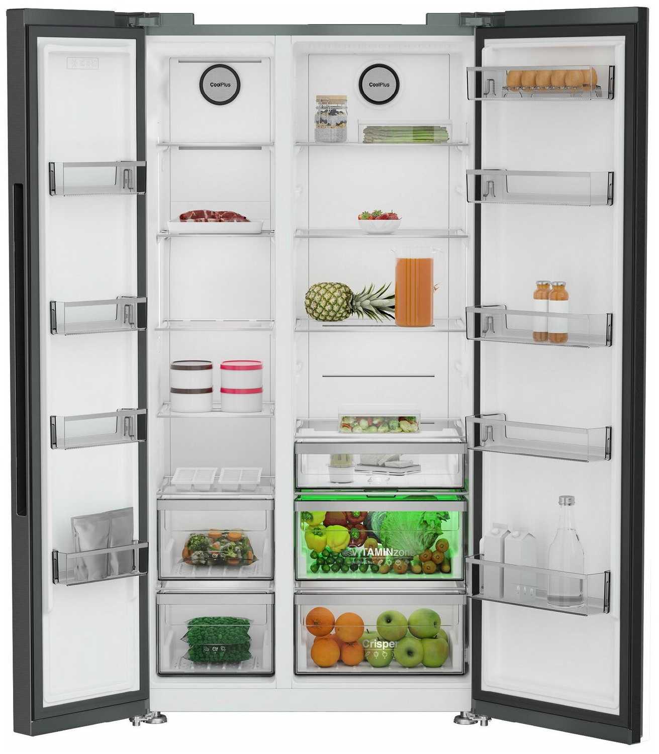 - Специальные зоны: фреш-секция для овощей/фруктов, отделение для скоропортящихся продуктов, стеллаж для бутылок.