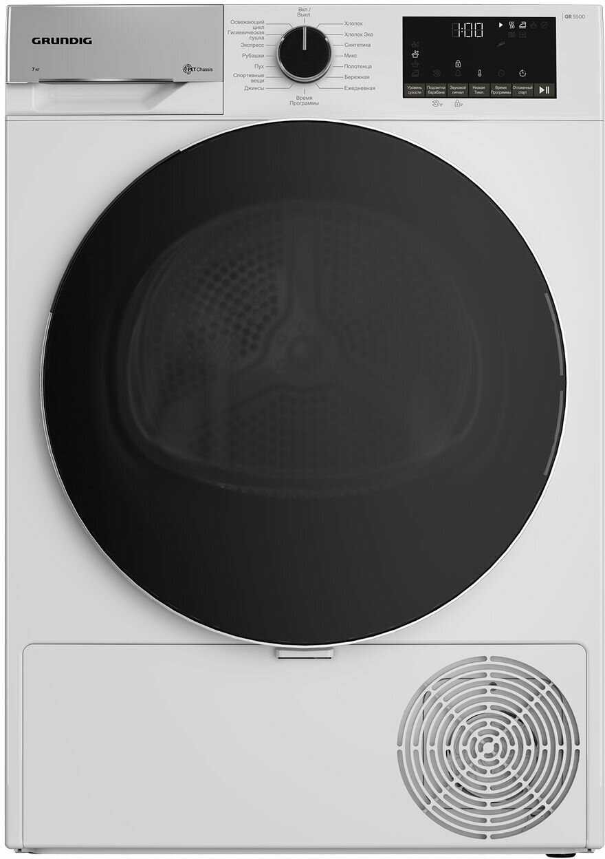 - + Cушильная машина Grundig. Покупал в комплект к стиральной машине этого же бренда и серии модели Prologue. 15 программ, бак на 92,5 литра, загрузка 7 килограмм. Для дома хватает. Сушка происходит с помощью теплового насоса, конденсат собирается в специальный контейнер. Сушит по остаточной влажности, поэтому время сушки в процессе может измениться.