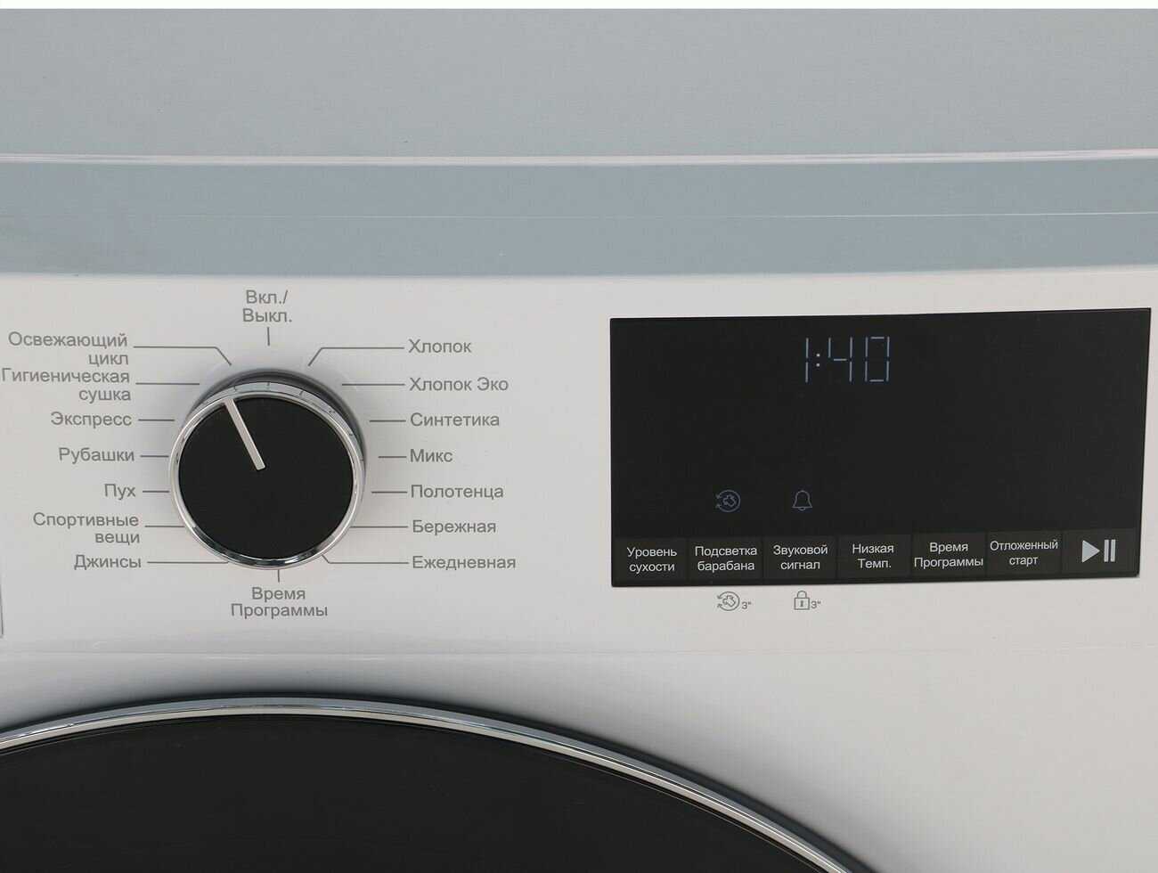 - Специализированные программы: "Джинсы", "Полотенца", "Детская одежда", "Экспресс-сушка (14 минут)", "Смешанные ткани".