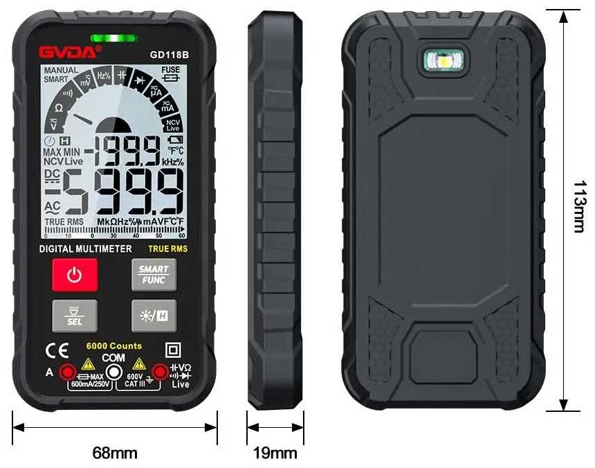 | Особенности : | автоматический выбор диапазона измерений, автоматическое выключение, подсветка дисплея, фиксация измерений, фонарик |
