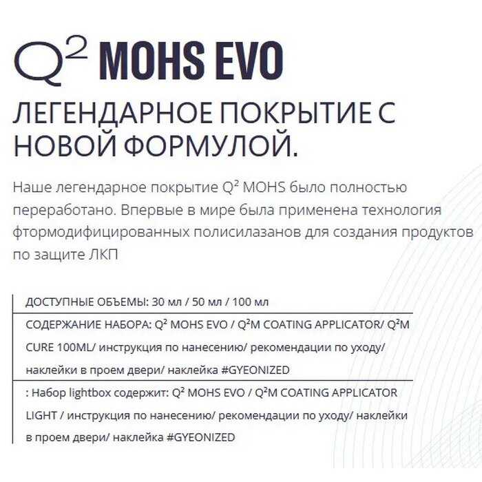 Подробная комплектация : | - Флакон с составом GYEON Q2 MOHS EVO 50 мл - Аппликатор для нанесения состава Q2M COATING APPLICATOR LIGHT - Инструкция - Рекомендации по уходу - Наклейки - Фирменная коробка |