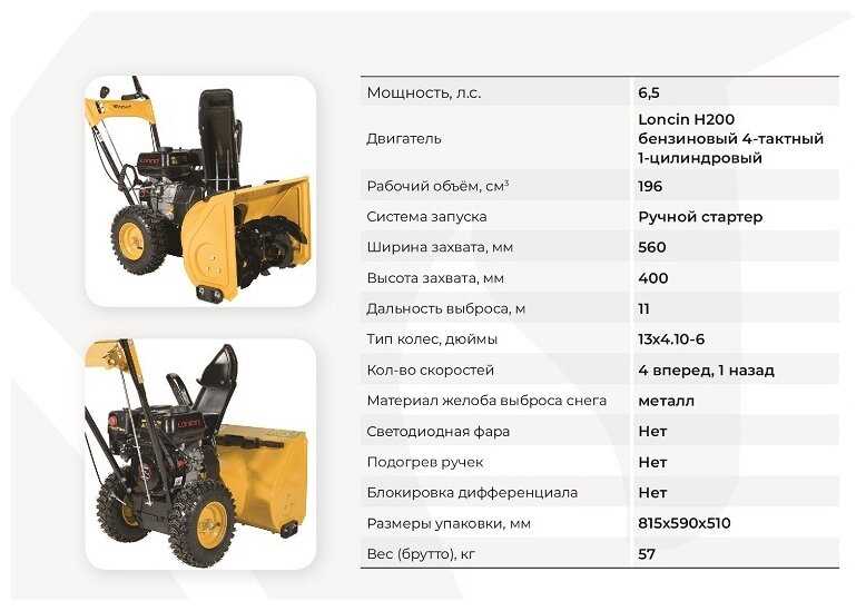 - + Компактный, экономичный в топливе, снег кидает далеко
