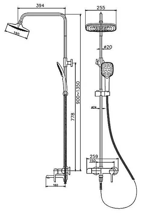 | Комплектация : | верхний душ, держатель лейки, душевая стойка, лейка, шланг |