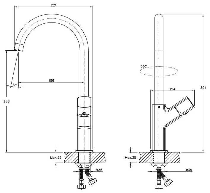 Приличный смеситель на мягкой подводке, устанавливается совершенно обычно без каких-либо наворотов. Форма излива обычная, но кран достаточно высокий. Угол подачи воды хороший не забрызгивает того, кто моет посуду. Гарантийный талон был вложен в коробку.