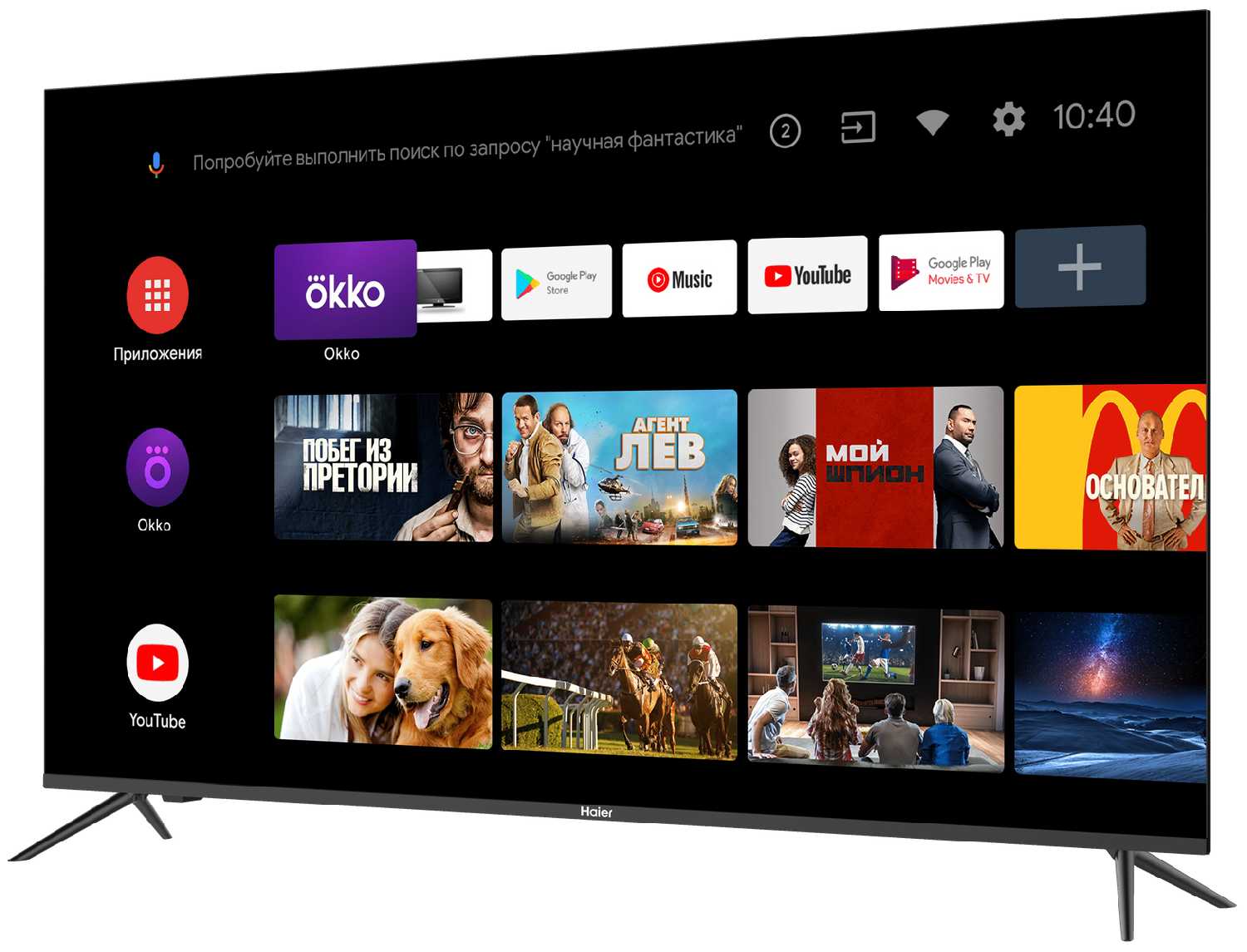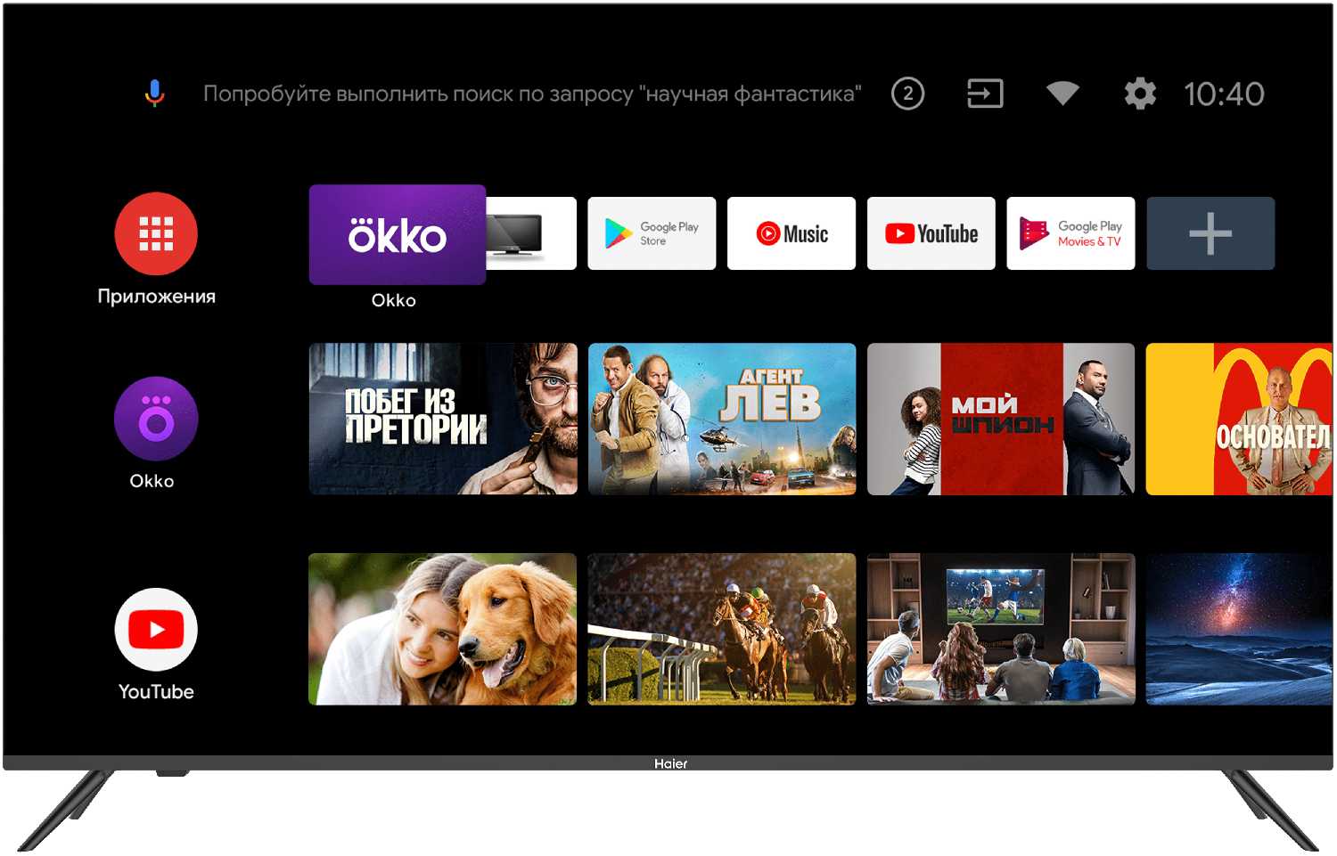 - Bluetooth 5.0 для подключения устройств, голосовой поиск через пульт, приложение Haier EVO с бесплатными каналами и подборками фильмов.
