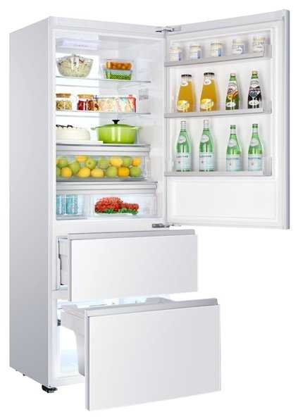 - Двойная морозильная камера с выдвижными ящиками и прозрачными лотками обеспечивает удобный доступ к продуктам без необходимости разморозки.
