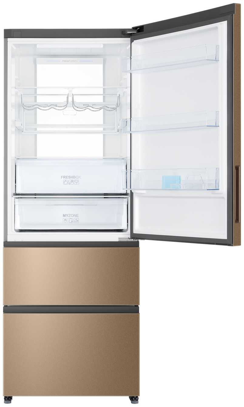 Холодильник очень вместительный и тихий. По сравнению с китайской версией (эта модель собрана в России) чуть толще стенки, другой двигатель, отсутствие подсветки морозильной камеры, но зато есть складная полка и складная полка для бутылок, ящик зоны свежести стал больше за счет отсутствия ящика для охлаждения бутылок. Брали по акции. М.Видео, как всегда все вовремя и по хорошей цене.