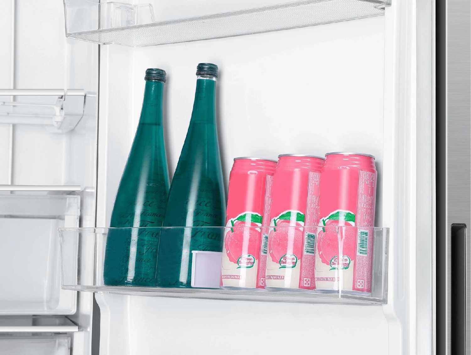 - Нижняя полка на дверце сужена по краям, что ограничивает размещение широких упаковок.