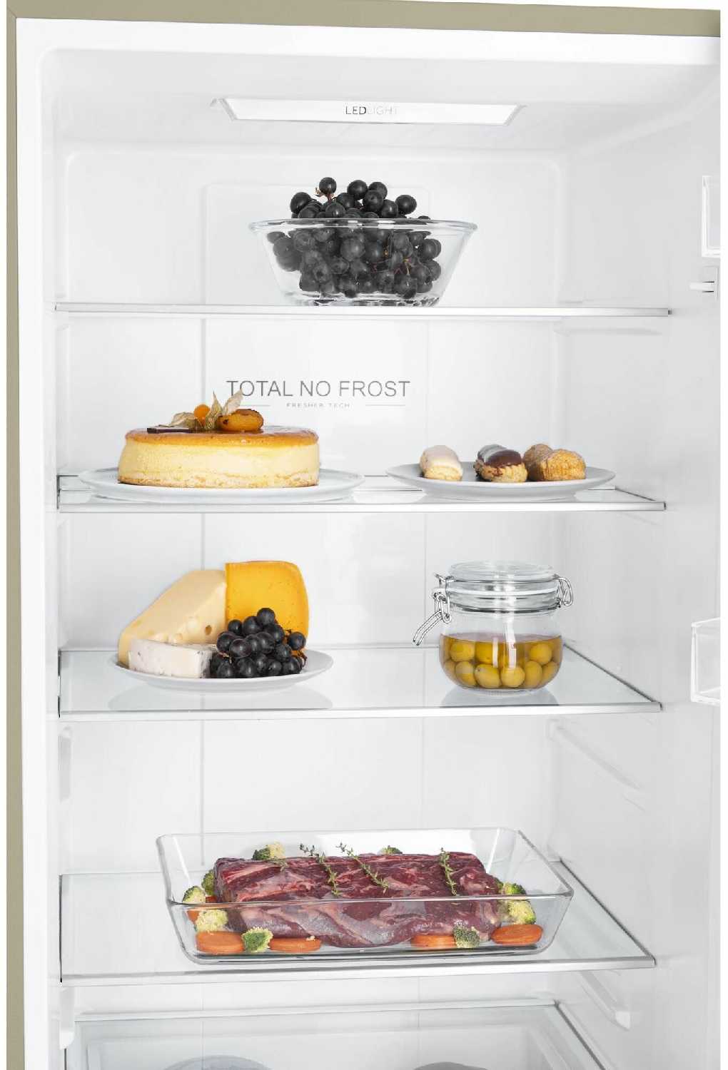 Холодильная камера объёмом 263 л и морозильная 103–105 л вмещают продукты для семьи из 4–5 человек, включая кастрюли под складной стеклянной полкой, большой вентилируемый ящик для овощей и фруктов (продукты дольше остаются свежими без запахов), 3 выдвижных ящика в морозилке и полки для яиц, масла, сыра. Регулируемые стеклянные полки с хромированной окантовкой прочные, легко моются, бутылки молока до 2 л помещаются на складной дверной полке, но 1,5-литровые иногда требуют её сложения. Многие отмечают удобство для негабаритных контейнеров под складной полкой в холодильной камере и замены верхнего морозильного ящика на полки для полуфабрикатов, хотя низкая полочка для бутылок на двери иногда приводит к выпадению пакетов с соусами.