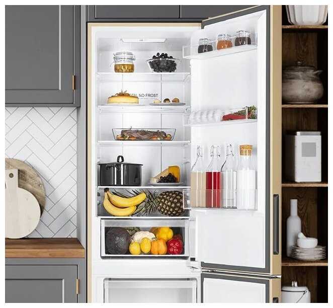Холодильная камера объёмом 263 л и морозильная 103–105 л вмещают продукты для семьи из 4–5 человек, включая кастрюли под складной стеклянной полкой, большой вентилируемый ящик для овощей и фруктов (продукты дольше остаются свежими без запахов), 3 выдвижных ящика в морозилке и полки для яиц, масла, сыра. Регулируемые стеклянные полки с хромированной окантовкой прочные, легко моются, бутылки молока до 2 л помещаются на складной дверной полке, но 1,5-литровые иногда требуют её сложения. Многие отмечают удобство для негабаритных контейнеров под складной полкой в холодильной камере и замены верхнего морозильного ящика на полки для полуфабрикатов, хотя низкая полочка для бутылок на двери иногда приводит к выпадению пакетов с соусами.