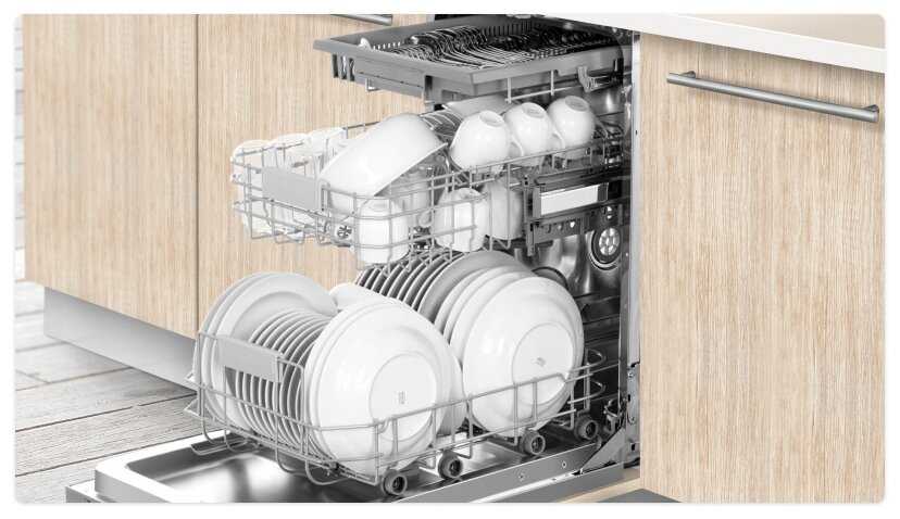 - Регулируемые перегородки в основных корзинах позволяют адаптировать под разную посуду, включая чашки и тарелки.