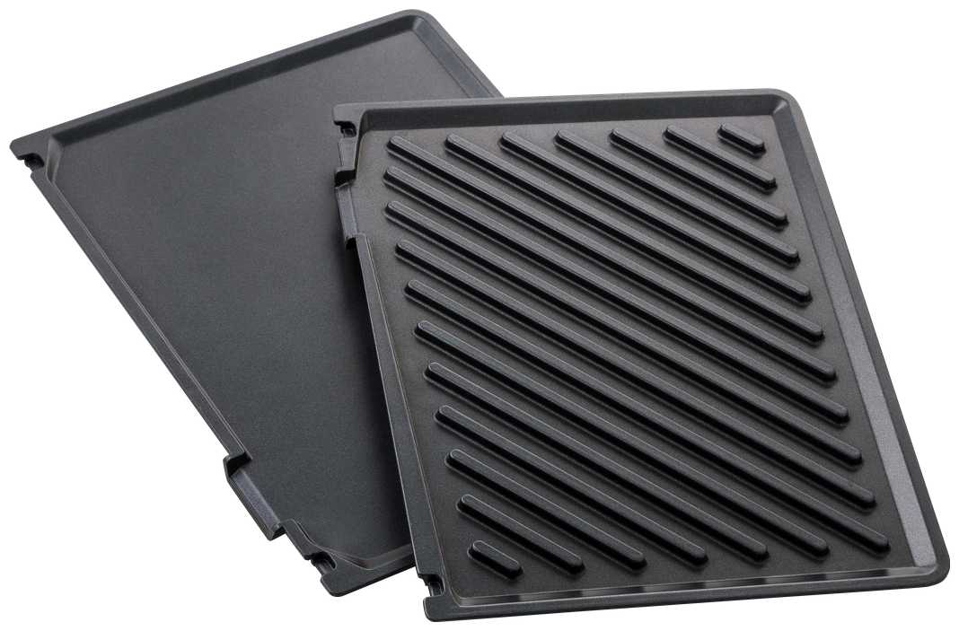 - Нижняя плоская панель подходит для яичницы, оладий и рыбы, верхняя ребристая создает «гриль-эффект» с полосами на мясе.